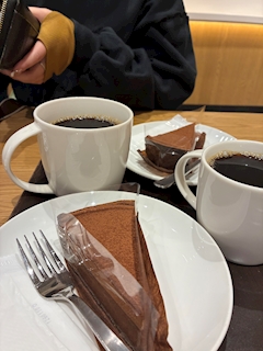 お友達とスタバにきました✨ チョコタルトとコーヒー☕️ 今日のコーヒーはカフェベロナ っていう種類でダークココアのような風味で美味しい😋