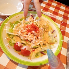 やぽ 久しぶりに サイゼリヤ来たー🥳 小エビのサラダ 美味しいよね♡ ( ˙˘˙)੭バッバイ 🌸本日出勤🌸